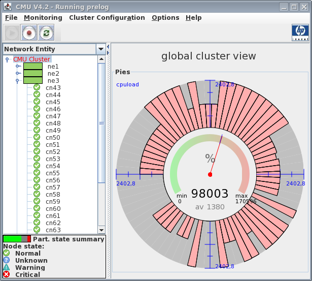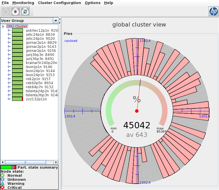 HP Cluster Management Utility (CMU) je osnovno orodje za trenutni nadzor stranja sestava. Uporabniki lahko vidijo trenutno zasedenost procesorjev, spomina in ostalih senzorjev, ki so na voljo. Aplikacija v JAVI je na voljo lokalno na nadzornem vozlišču http://prelog.hpc:8008/ Za pravilni zagon je potrebno prvič izbrati JNI web start, ki se nahaja na /usr/java/latest/javaws/javaws . Možno pa je JAR program pognati zudi z ukazne lupine kot