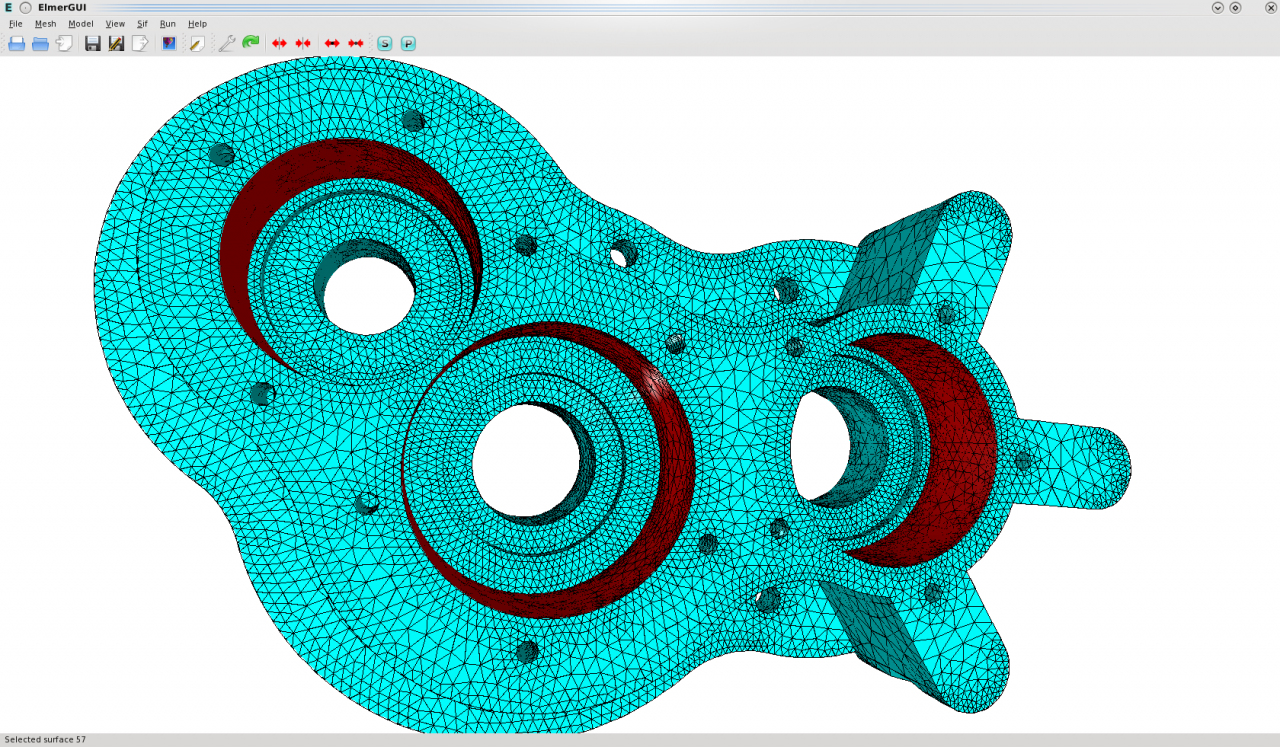 Po odprtju datoteke se nam v novem oknu prikaže geometrija objekta in prične generiranje mreže končnih elementov. Kontrolni izpisi generiranja se prikazujejo v terminalskem oknu. Ko je generiranje končano se nam v ElmerGUI oknu prikaže geometrija objekta z generirano mrežo končnih elementov.