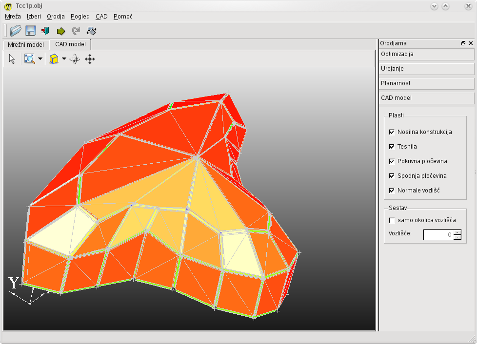Na slikah vidimo modelirnik s katerim lahko interaktivno optimiziramo izhodiščno mrežo na želeno končno obliko s podajanjem uteži različnim cenilkam in hkrati upoštevamo omejitve geometrije kot je planarnost ploskev ali koničnost vozlišč. Z optimiziranjem dobimo želeno obliko in hkrati dobimo tudi ravnost ploskev, kar lahko sproti analiziramo. Zaradi unikatnosti vseh elementov strukture je izdelan generator CAD geometrije v kateri lahko neposredno preverjamo različne koncepte geometrije vozlišč in optimizacijo pod-konstrukcije. Celoto ali izbrane dele lahko nato izvozimo v standardne modelirnike za nadaljno analizo in preračune.